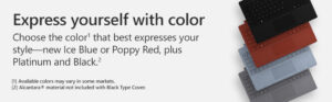 Dans l’ensemble, La coque Surface Pro Signature Type offre non seulement une expérience de clavier et de saisie confortable. Mais reflète également votre style personnel. Ainsi, Choisissez parmi des couleurs riches : platine, bleu glacier ou rouge coquelicot en alcantara et noir. Mélangez et assortissez avec le stylet Surface Pen et la souris Surface Arc.