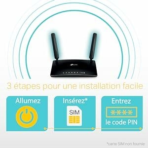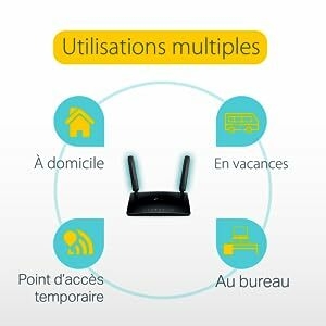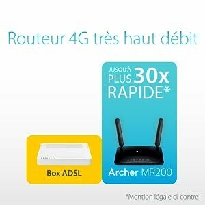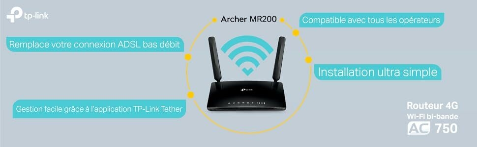 Profitez d’une connexion haut débitL’Archer MR200 offre un WiFi bi-bande, 433 Mbps en 5 GHz ou 300 Mbps en 2.4 GHz. Avec ce modem/routeur 4G, vous pouvez partager votre WiFi avec tous les membres de la famille pour connecter tous vos appareils au quotidien (tablettes, ordinateurs portables et smartphones) en simultané. | Installation très simpleTout ce que vous devez faire c’est d’allumer le modem/routeur TP-Link, insérer la carte SIM 4G, entrer le code PIN et suivre quelques étapes de paramétrage. | Emportez votre WiFi partoutL’Archer MR200 offre un confort et une polyvalence inégalés. Il permet d’établir rapidement un réseau WiFi performant et stable. C’est la solution idéale si vous êtes à la maison ou pour travailler depuis une zone où le débit ADSL est insuffisant. |